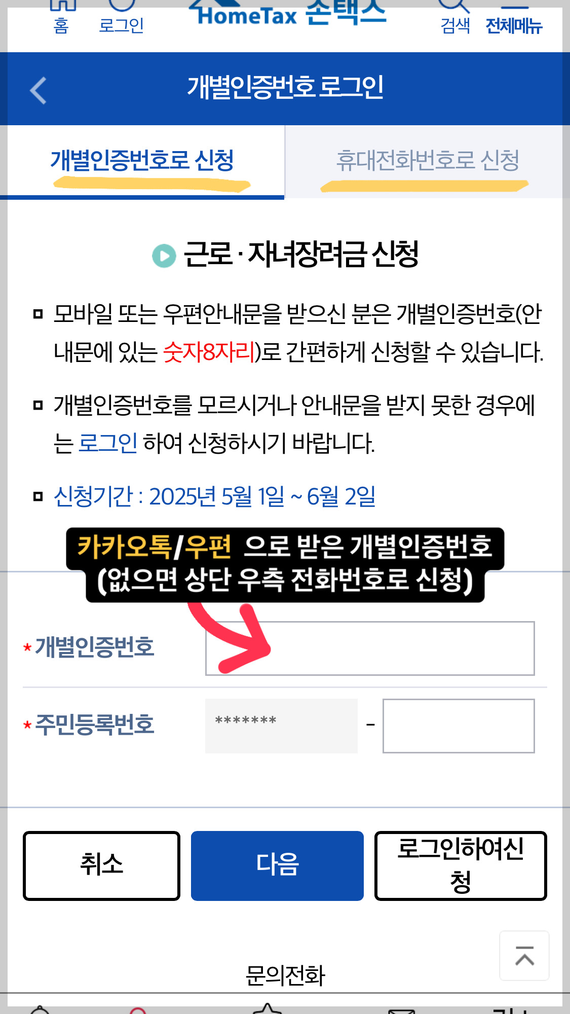 생년월일 + 주민번호 뒷자리 입력만으로 간편하게 신청가능